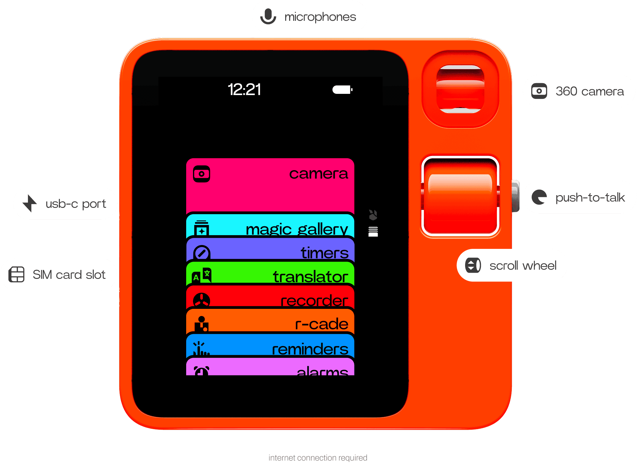 The device has a 2.88-inch touchscreen, a 360-degree rotating camera, a built-in microphone and speaker, a SIM card slot (4G capable), and a USB-C charging port. It connects to WiFi and cellular networks independently, no phone required.